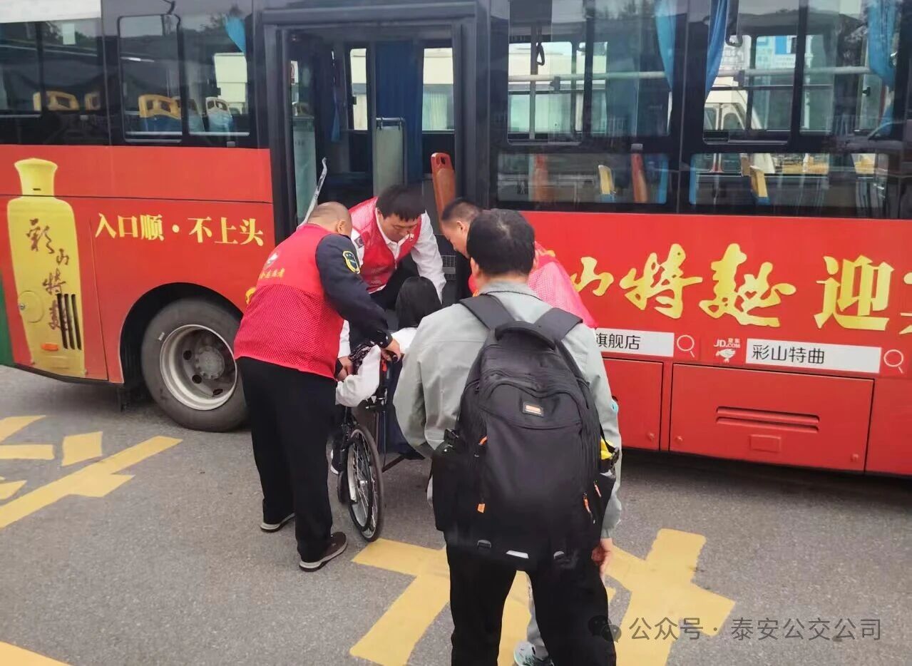同日,天外村公交樞紐站同樣游客如織。第五分公司公交志愿者趙峰、唐圣春、李磊、劉一鳴正在現場(chǎng)維持乘車(chē)秩序,這時(shí),他們發(fā)現不遠處有位腿腳不便的男士,正牽著(zhù)孩子、推著(zhù)輪椅上的愛(ài)人,朝著(zhù)旅游專(zhuān)線(xiàn)乘車(chē)處趕來(lái)。趙峰立刻主動(dòng)走上前詢(xún)問(wèn)需求,得知這是一家三口來(lái)泰山旅游,下山后需要乘車(chē)前往紅門(mén)。