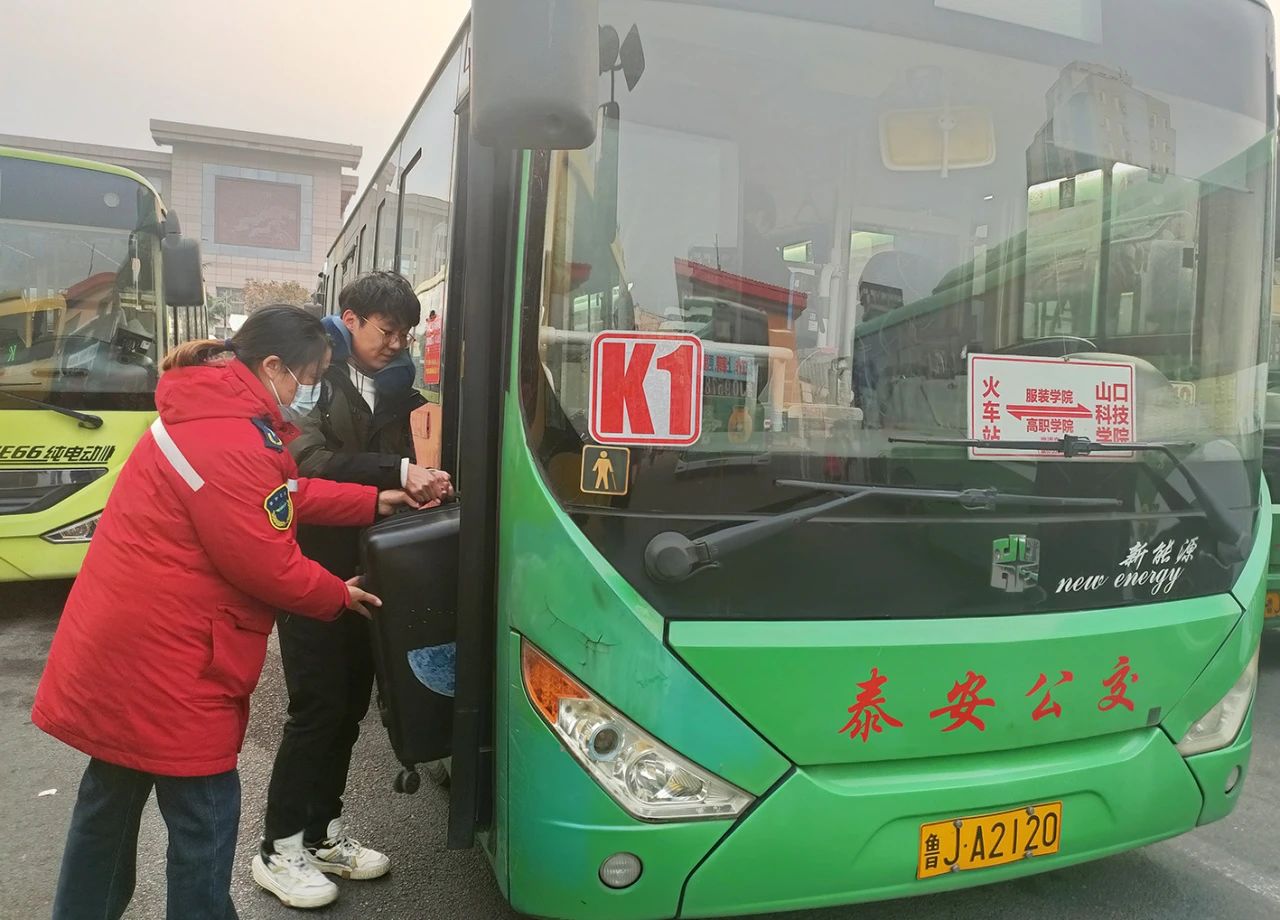 在泰山火車(chē)站公交樞紐站,泰安公交工作人員放置了寫(xiě)有“火車(chē)站—山東服裝學(xué)院—泰山職業(yè)學(xué)院—泰山科技學(xué)院”的直通車(chē)標識牌,還組織公交志愿者協(xié)助大學(xué)生在車(chē)內有序擺放行李,全力保障大學(xué)生安全乘車(chē)。一位來(lái)自泰山科技學(xué)院、家在德州的大學(xué)生稱(chēng)贊道:“現在一出火車(chē)站就能直接坐上學(xué)校的直通公交車(chē),還直接送到學(xué)校門(mén)口,避免了乘坐常規公交車(chē)的擁擠,而且路途長(cháng),這樣節省了我們很多時(shí)間。”